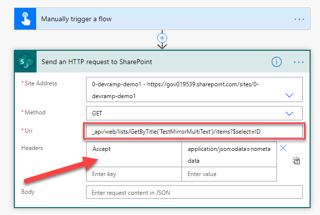Step # 2 – First let’s get all items IDs (plus required fields) from the list using ‘Send an HTTP request to SharePoint’.