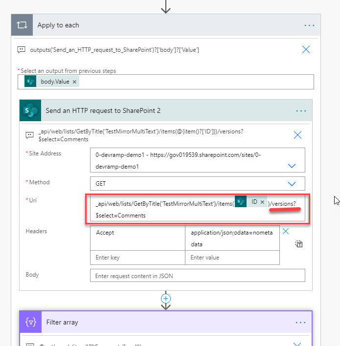 _api/web/lists/GetByTitle('TestMirrorMultiText')/items(@{items('Apply_to_each')?['ID']})/versions?$select=Comments