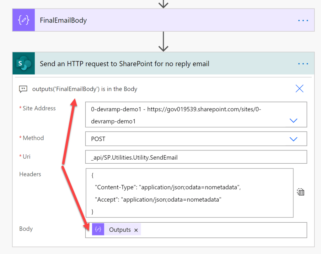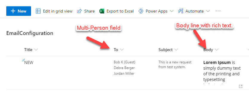 The following is the sample list with Subject, Body and TO (with multi-person) fields data. How to read this information and create the JSON body for the no reply email?