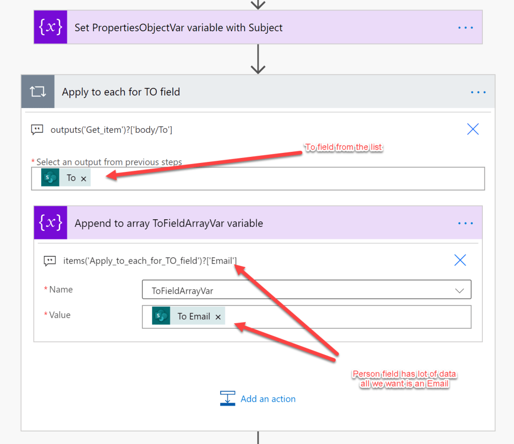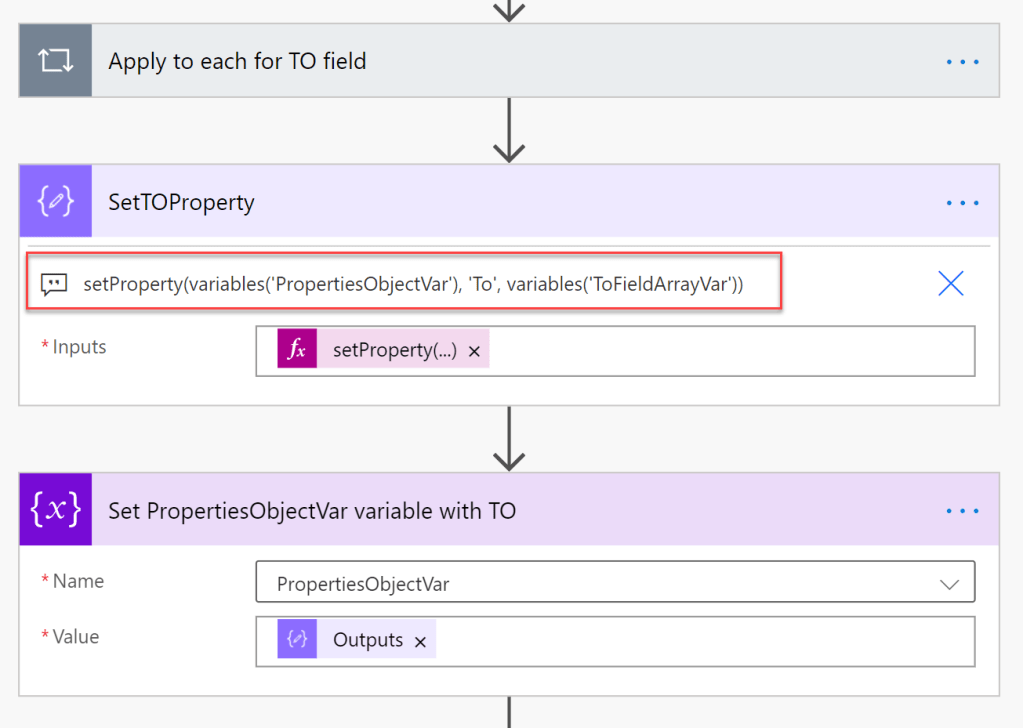 Now there is a trick here, we need the JSON Array object. In the Apply Each action first get all values in the Array variable ‘ToFieldArrayVar’.