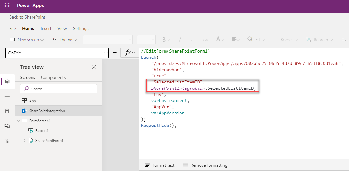 Step # 5 Act on the value of the SelectedListItemID property in the full-screen canvas app. The following code is still in the OnStart event. This will make SharePoint List record new or edit based on the varSelectedListItemId.