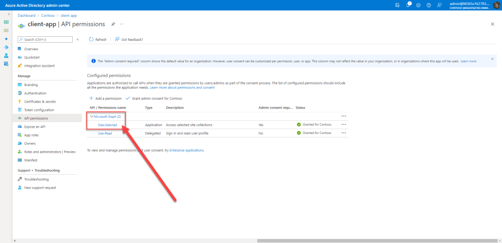 For example, if the customer wants to have access to a few sites as a read permissions the “Site.Selected” permission techniques can be used to meet the need.