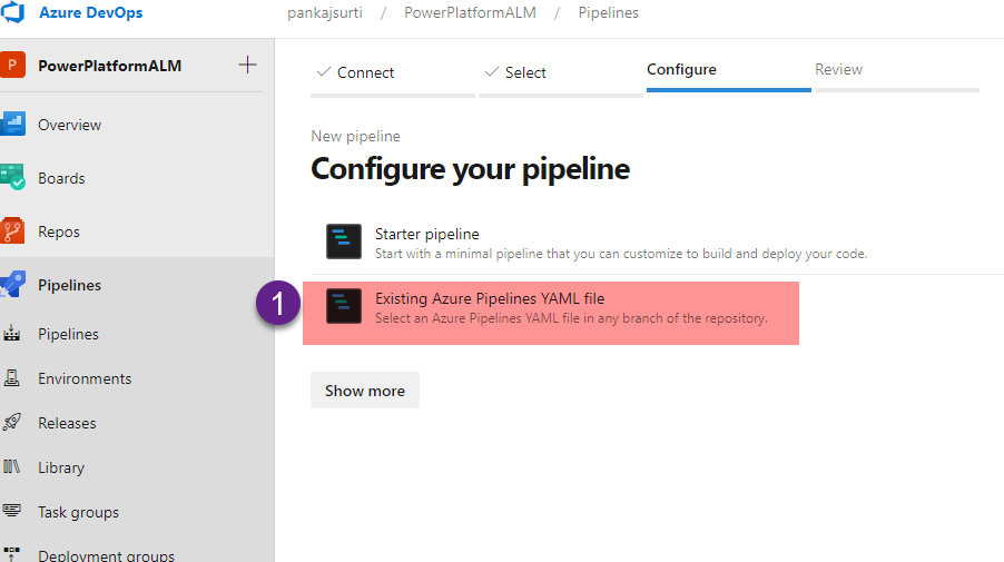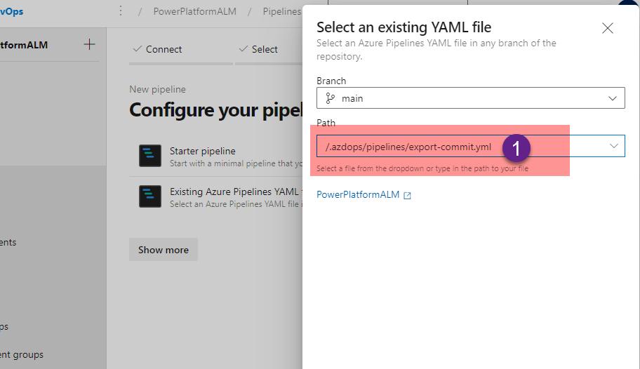 Select the /.azdops/pipelines/{YOURSOLUTIONNAME-build-deploy.yml file. (You created in the step # 8)