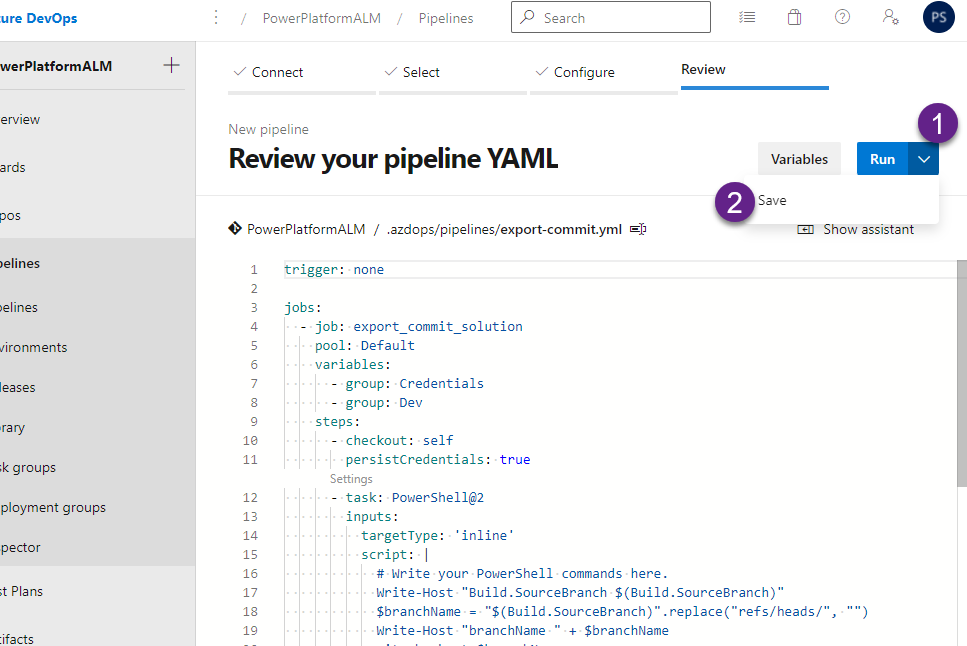 Step # 9 Create a Pipeline using the existing file .azdops\pipelines\export-commit.yml