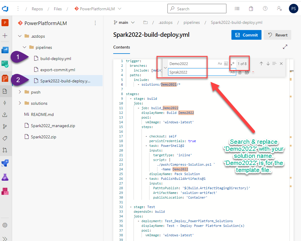 Consider the file .azdops\pipelines\build-deploy.yml as the template for your Power Platform Solution. From the above example for ‘Spark2022’ solution name I created the copy of the template to a new file named ‘Spark2022-build-deploy.yml’.