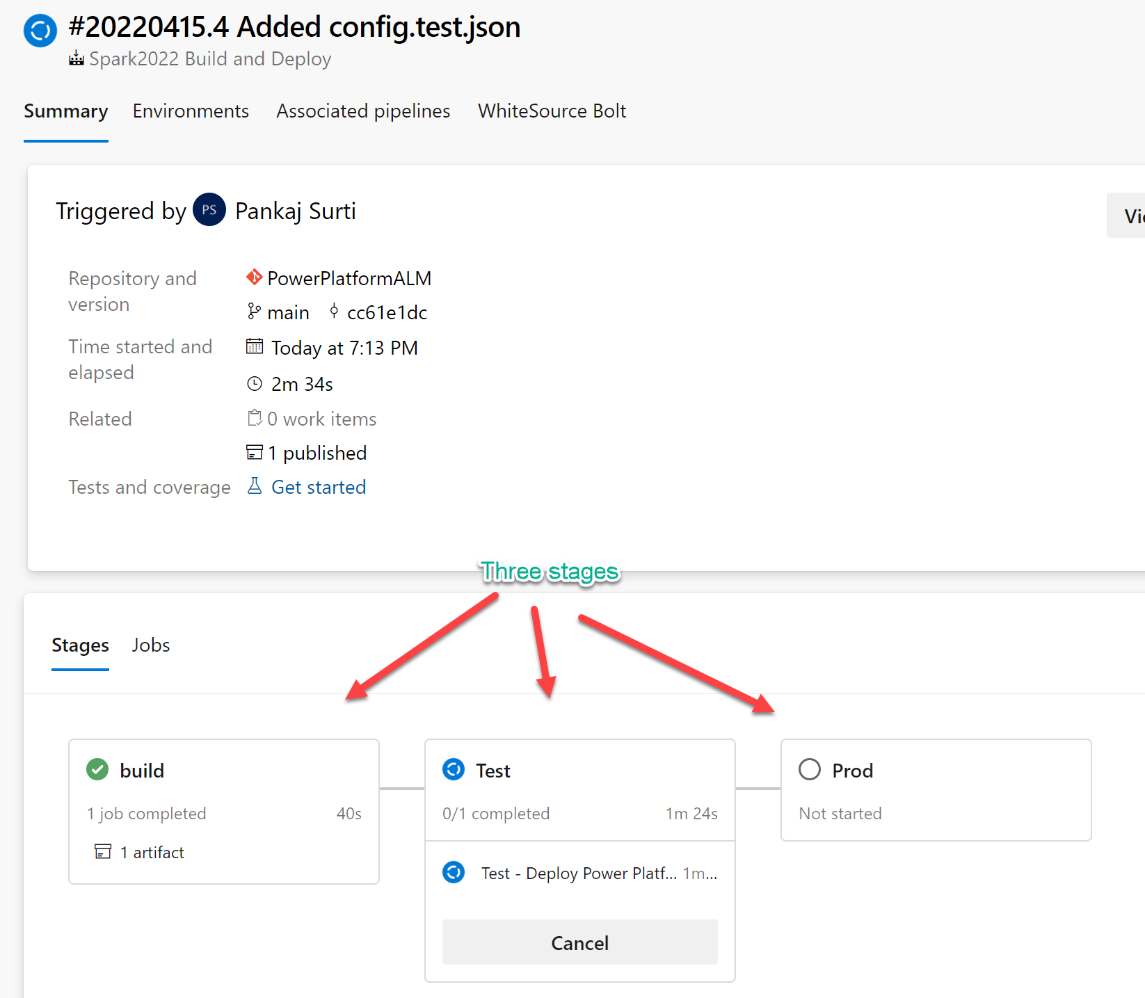 The save of these files will trigger the build if not, run the pipeline, you will see the multi-stage for Build, Test, and Prod