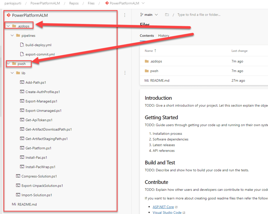 The final results to the Azure DevOps repository should look similar to the following. The .azdops and pwsh folders should be the top folder in your repository.