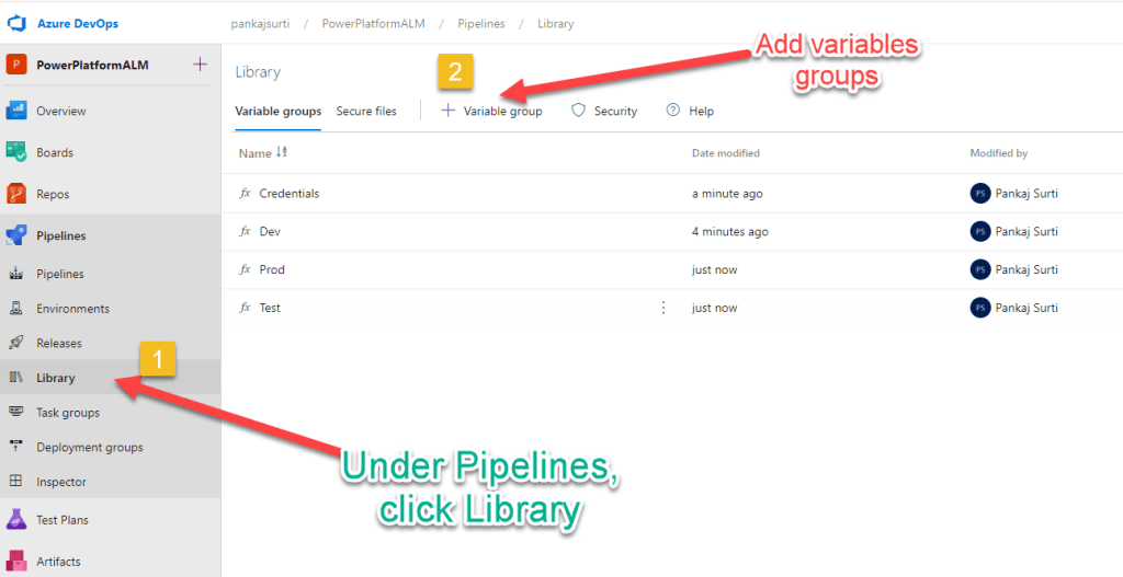 Step # 6 Create Azure Pipelines variable groups ‘Credentials’, ‘Dev’, ‘Test’, and ‘Prod’.