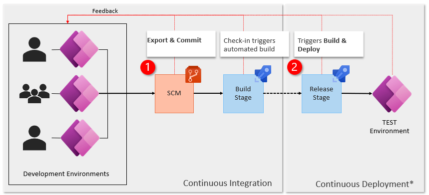 The below flow chart gives an overview of the process. The developers run the “Export & Commit” by the SolutionName. This action “1” exports the Solution and Commits to the Source Control Managemen (SCM). The checking in the file(s) for the solution auto triggers the “Build & Release” pipeline which eventually put the managed solution in the TEST or PROD environments.