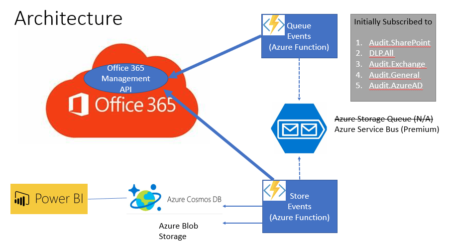 After the above steps you should be able to see the audit data. But these are all manual steps to get the content. To automate these you will need to use the Azure resources such as Azure Storage, Azure Functions, and Azure Cosmos DB. The following is the logical architecture that depicts those Azure resources.